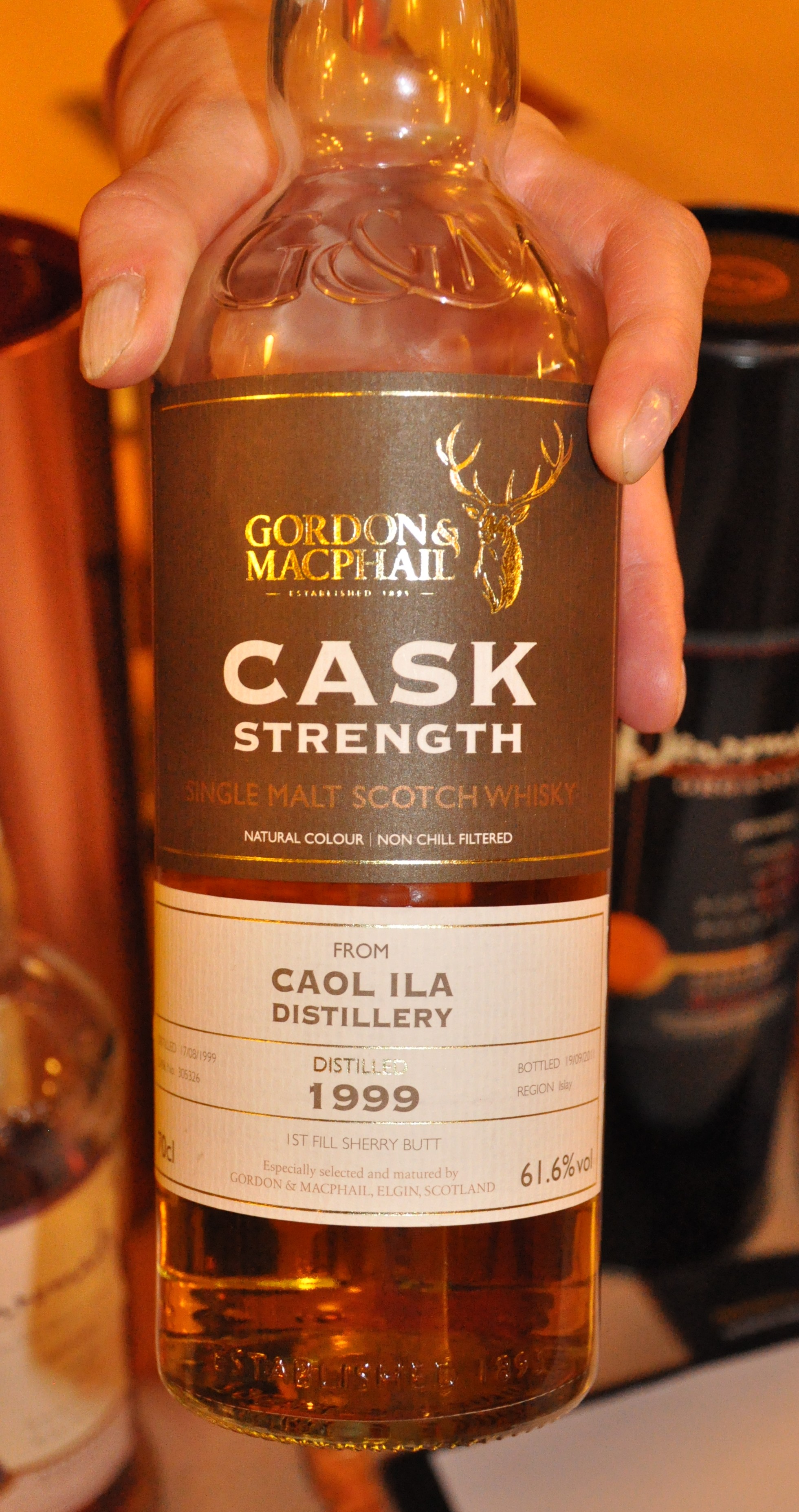 Dopo 12 anni trascorsi in una botte di sherry first fill, questo Caol Ila della Gordon&MacPhail è stato imbottigliato il 19 settembre di quest’anno (ricorrenza tanto cara a Jacopo, che nello stesso giorno di 28 anni fa ha deciso di omaggiarci della sua imprescindibile presenza sul pianeta) e nessuno ha ancora avuto modo di affidare le sue impressioni al mare magnum di Internet. Questo malto fa parte della serie Cask Strenght della G&M, ma per ora risulta acquistabile solo su pochissimi siti. Un vero peccato perchè, terminata la degustazione, un pensiero comune e ben poco articolato affollava la stanza: “Ancora, ancora…”.