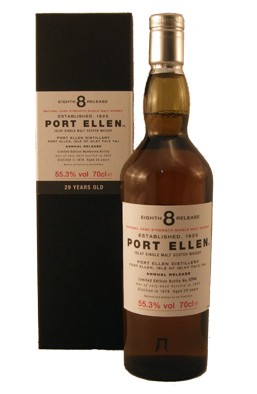 Ma davvero non avevamo ancora recensito un Port Ellen? Poniamo subito rimedio a questa grave falla assaggiando l’ottava versione ufficiale: come saprete, e se non lo sapete, beh, sappiatelo, la Port Ellen era una distilleria di Islay, chiusa nel 1983 perché travolta dallo sgonfiarsi del mercato post-anni ’70. La Diageo, dopo aver venduto gran parte degli stock a imbottigliatori indipendenti, si è poi accorta che dopo un po’ di tempo le botti rimaste a invecchiare probabilmente più del previsto erano veramente spettacolari: dal 2001 è stata lanciata la serie delle annual releases, ovvero vintage speciali che ogni anno vengono razziati dai collezionisti (il sito masterofmalt.com ha terminato le sue bottiglie in tre minuti, quest’anno…) e che, con il tempo, vedono il loro valore lievitare vertiginosamente. Attualmente la Port Ellen è stata interamente adibita a maltatoio e provvede a rifornire le altre distillerie dell’isola. Noi proviamo l’8th release, distillato nel 1978 e imbottigliato nel 2008 (29 anni dichiarati, perché i 30 non sono stati pienamente raggiunti): il colore è di un dorato molto chiaro.