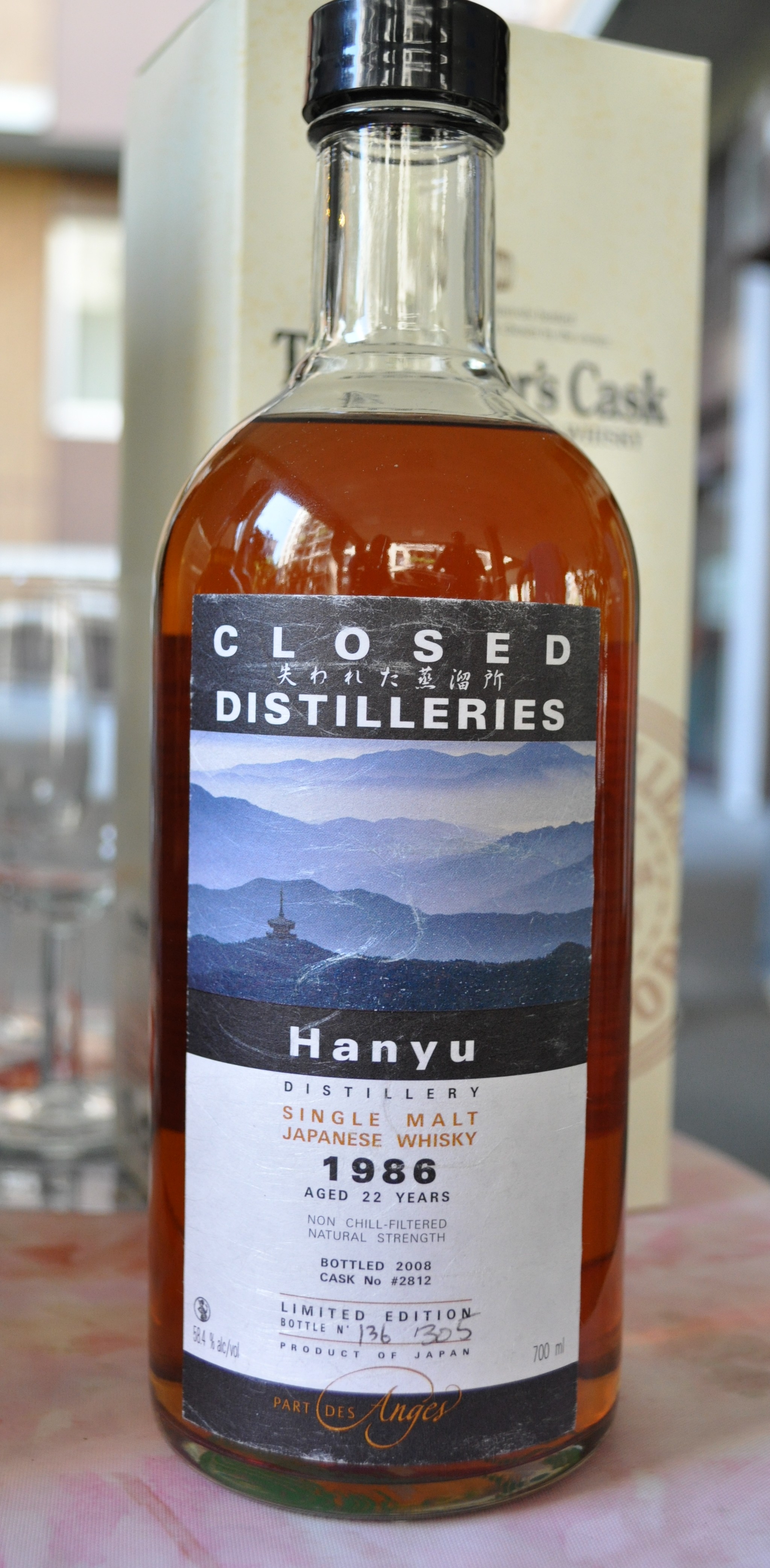 Il penultimo whisky che ci ha presentato Salvatore Mannino la scorsa settimana era un Hanyu di 22 anni, un single cask (#2812) imbottigliato da Part des Anges, importatore e imbottigliatore francese, nella serie ‘Closed Distilleries’. Quest’ultima nota, se siete dei ragazzi svegli, vi farà capire che Hanyu è una distilleria che non c’è più: la storia dettagliata la potete leggere sul sito che è la vera bibbia del whisky giapponese, ovvero Nonjatta; per ora vi basti sapere che Hanyu ha una “nipotina” (Chichibu, di cui assaggeremo ben due espressioni nei prossimi giorni)… Ma su questo torneremo. La bottiglia è molto bella, e l’etichetta – per quanti si dilettano in tali amenità – è in carta di riso.