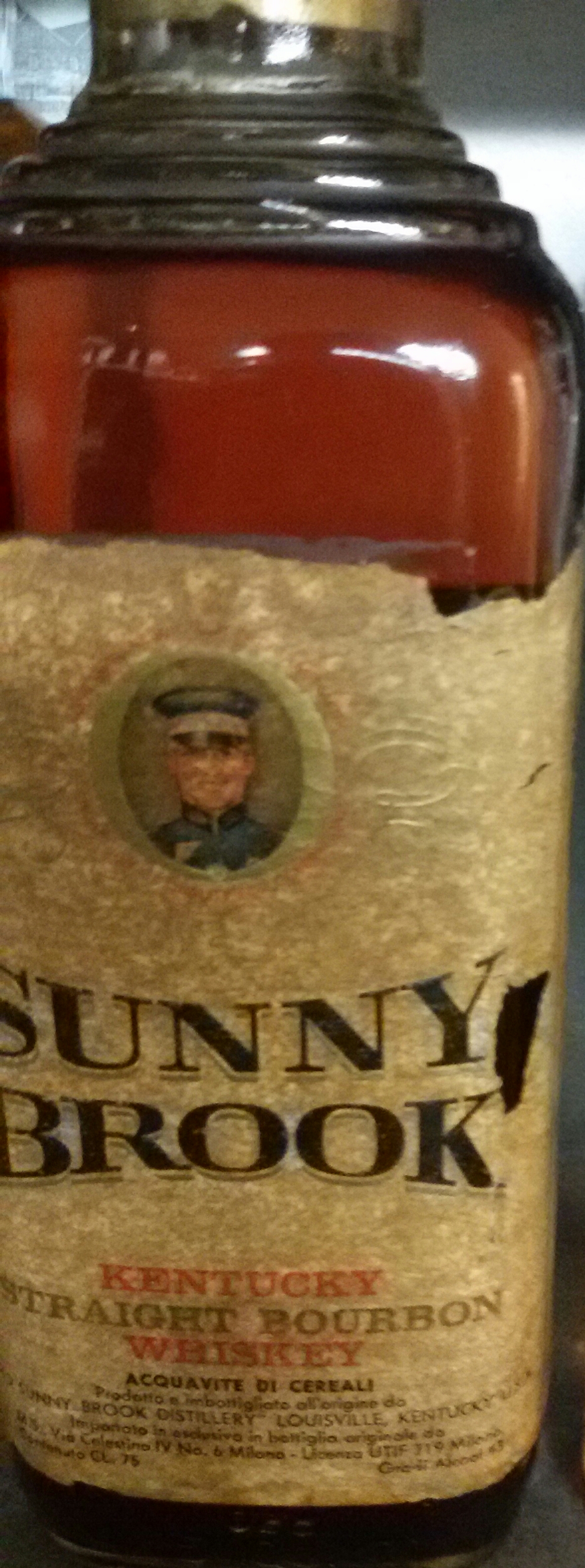Giovedì prossimo saremo ospiti dell’Harp Pub per una degustazione di whisky dal mondo. Avremo con noi un giapponese, un blended scozzese, un canadese e questo vecchio imbottigliamento della Sunny Brook, storica distilleria di Louisville, nel Kentucky, che ha chiuso i battenti nel 1975. Si tratta di un import per l’Italia, che a questo punto è da collocarsi almeno negli anni ’70, se non prima. Il Sunny Brook, invecchiato 4 anni, faceva parte della famiglia dei Kentucky Straight Bourbon Whiskey, ovverosia distillati ottenuti da una miscela di cereali di cui almeno il 51% sia mais, e poi invecchiati per almeno un anno nel Kentucky, vera e propria patria del Bourbon Whiskey.