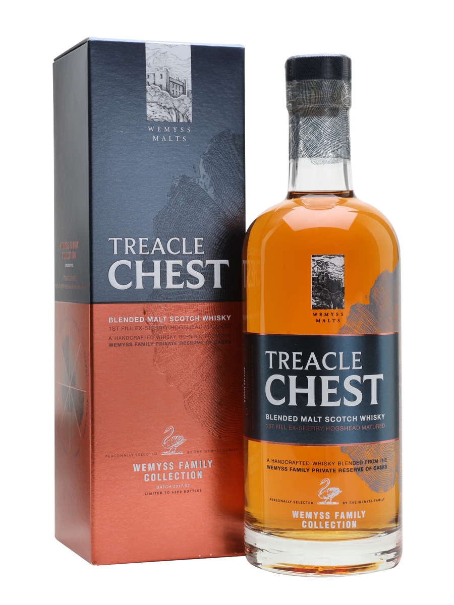 Wemyss è un imbottigliatore indipendente che da qualche anno – a onor del vero, prima di altri – ha deciso di investire commercialmente su concept whisky, su miscele di barili selezionati in base ad un profilo aromatico preciso e imbottigliati spesso senza età dichiarata e con un nome relativamente esotico, teso a esplicitare il concept di cui sopra. La scorsa settimana abbiamo avuto il piacere di partecipare ad una degustazione su Twitter, organizzata da The Whisky Wire, in cui abbiamo assaggiato assieme a tanti altri squilibrati sparsi per il globo tre espressioni di Wemyss: Treacle Chest, che recensiamo oggi, è un blended malt (quello che una volta si chiamava vatted, ovvero miscela di soli malti, no grano) di whisky delle Highlands maturato in 14 sherry casks. Assaggiamo, non prima di aver notato che hey!, hanno cambiato packaging!