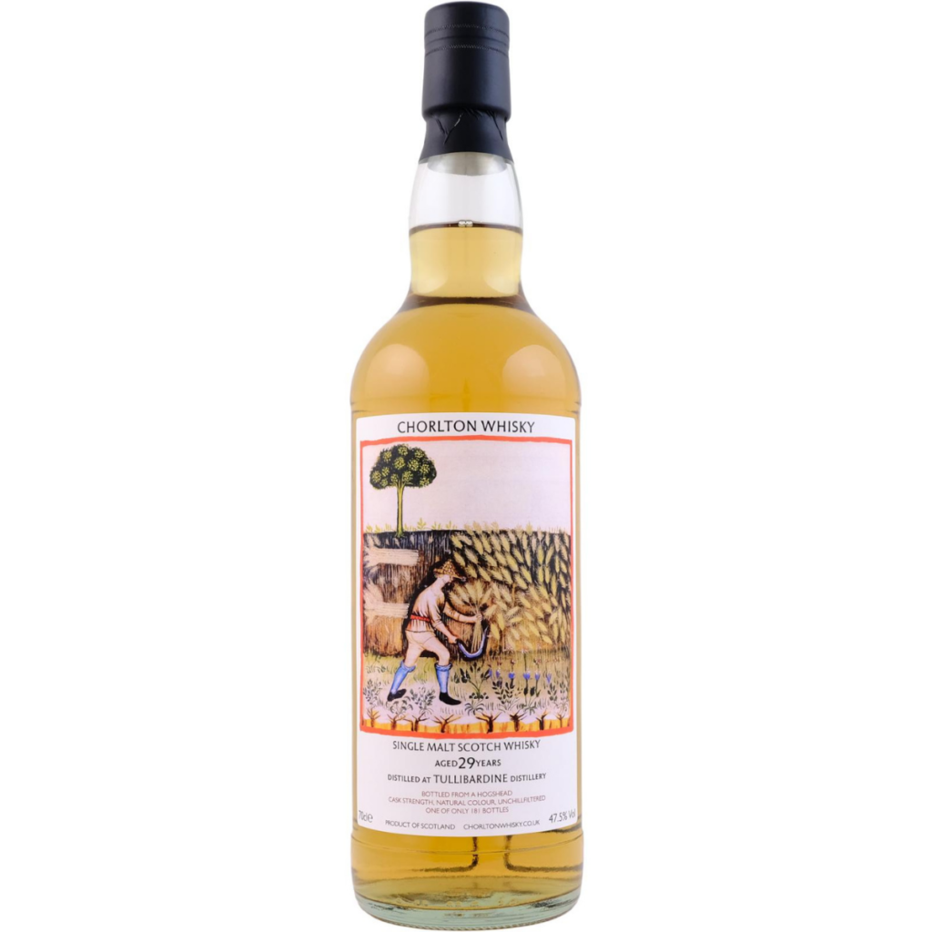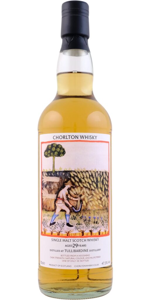 Prosegue la settimana in compagnia degli imbottigliamenti di Chorlton dalla serie “Nouvelle vague”, con annesse etichette di scene medievali bucoliche. Oggi tocca a un onusto Tullibardine, distilleria che qualche simpatico guascone definì “la nuova Macallan”. Si scherza, Tullibardine conosce i suoi limiti. E se non li conosce ci siamo qui noi per ricordarglieli: raramente ne abbiamo assaggiato uno buono. Oggi potrebbe essere la volta buona? Un 29 anni a grado pieno invecchiato in un ex bourbon hogshead, che ha dato 181 bottiglie. Dai, San Chorlton fai il miracolo: trasforma il Tullibardine in ambrosia! Il colore è vino bianco.