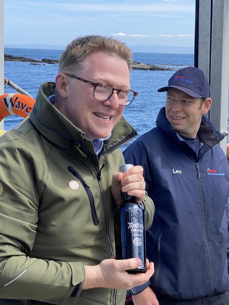 So, while he and some of his colleagues in fortune and journalism were having a great time in a boat off the distillery, gorging on raw fresh scallops and lobster, out of the waters of the Inner Hebrides a scuba diver popped up – like a masculine Botticelli’s Venus -, bearing a mysterious metal crate obviously filled with a precious bottle. Presented by David Blackmore (pictured below), the global ambassador of Ardbeg and Glenmorangie, our correspondent had the priviledge to taste it, he took home a decent sample, and now we present and review it for you.