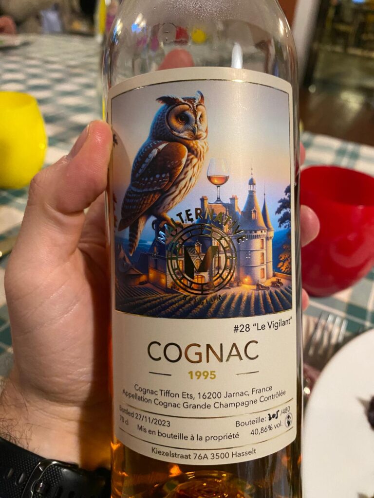 Il distillatore è Tiffon, la zona di produzione è la Grande Champagne, a torto o a ragione considerata la zona d’elezione del Cognac. 480 le bottiglie prodotte. C: ambra chiara. N: si apre dolce, con albicocca secca e pesche, mele cotte e cannella. C’è quasi una nota mentolata che ricorda il dentifricio! Cremoso, balsamo per i capelli, mela verde. Poi, una nota che ci ricorda i confetti al cioccolato bianco di certi matrimoni finiti in trenini e hangover. Fresco e cangiante. P: più asciutto, con molta frutta secca (mandorla, cocco tostato) e noccioli di amarena. Amarena anche. Mallo di noce. F: mandorla, arancia amara, ancora noccioli, un filo astringente.
