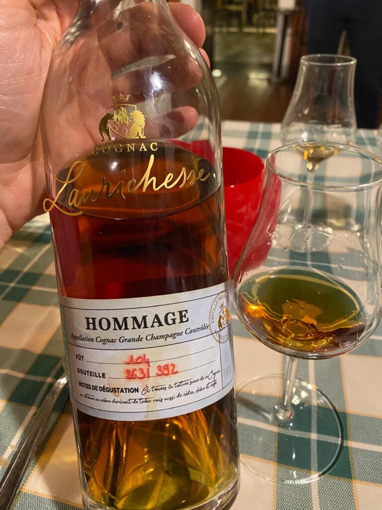 Ebbene sì, con il dessert si è bevuto un Cognac di 113 anni della zona dei Borderies, in esclusiva per Italia e Canada. 42 bottiglie, di cui 18 nel nostro Paese. Si tratta di uno di quei distillati che riposano nel cosiddetto “Paradis”, una stanza senza finestre in cui molte maison fanno invecchiare in damigiane di vetro i Cognac più vetusti, una volta svuotate le botti. Questo, per esempio, ha passato 81 anni in legno (fino al 1992), poi è rimasto in damigiana. Il vetro è materiale inerte, ma – l’OBE ce lo insegna – l’evoluzione continua anche lì, seppur diversamente. C: aranciato. N: fa quasi rabbrividire, un po’ perché la mente ci dice che stiamo annusando qualcosa di ultrasecolare, un po’ perché l’eleganza è infinita. I bouquet di un matrimonio di classe si mischiano a pesche nettarine e mandarini, il legno cuce insieme un arazzo di sensazioni, che vanno dai litches al melone fino alla pasta burrosa del pandoro e a qualcosa che ricorda le olive nere, magia del legno. P: di tutti i Cognac assaggiati stasera, è l’unico che mostra un po’ la corda dal punto di vista della vivacità di sorso. E ci mancherebbe, considerando che l’età. La sensazione – corroborata da quella gradazione borderline di 40.1% – è che sia stato “preso per i capelli”. Insomma, è un po’ seduto in poltrona. Tabacco, di quelli floreali, noci pecan, miele di castagno poco dolce. La parte legnosa regala suggestioni di liquirizia e té nero, con una piccantezza delicata di zenzero. E ancora di nuovo sigaro Cohiba non ancora acceso, chinotto, fava di cacao… F: amaricante, bucce di chinotto, prugne secche e una lunga scia di legno.