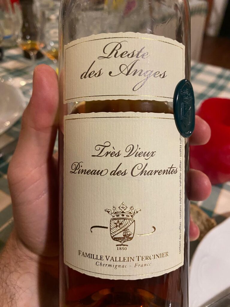 Piccolo intermezzo senza voto: con il tris di formaggi erborinati arriva un Pineau des Charentes di 25 anni di Tercinier. Il Pineau è – come spiega Davide – un “prodotto intermedio”. Di fatto, è mosto d’uva a cui viene aggiunto distillato di vino non invecchiato, Cognac bianco insomma. Un po’ come i vini fortificati. Nella fattispecie, questo Pineau è un’esperienza quasi mistica, il cui olfatto è dominato da note oscure di funghi porcini secchi e tartufo, che virano verso il tortino di cioccolato. Al palato è acido, dolce e piacevole, più sull’uva passa e l’albicocca, senza più le deviazioni umami del naso. Finale sticky, tra cola e limone. Ma non è un distillato, quindi non lo votiamo.