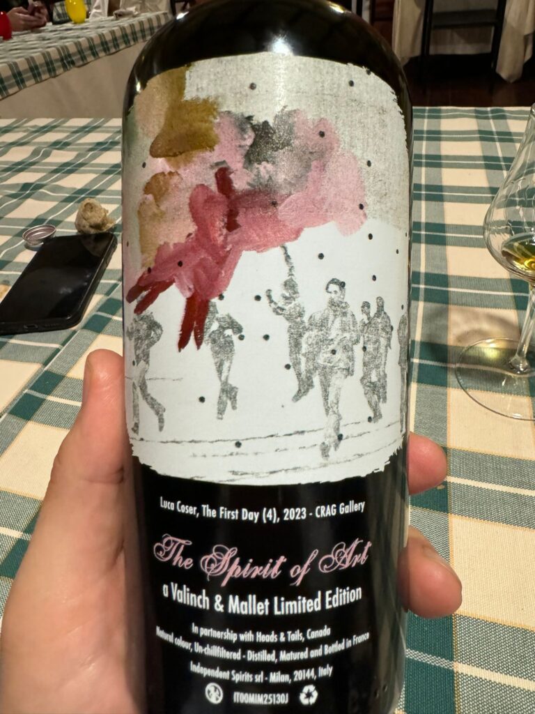 Chiusura col botto fuori programma, con il nuovo Cognac imbottigliato con etichetta V&M che sta arrivando sugli scaffali proprio in questi giorni. Siamo nella regione del Fins Bois e il grado è altino. Disclaimer: è in bottiglia da poche settimane, quindi le note possono risentirne. C: ambrato. N: il più citrico fra tutti, con kumquat e lemongrass. Ma c’è molto di più, solo bisogna un attimo mettere ordine nelle sensazioni: c’è innanzitutto qualcosa di pungente, come buccia di albicocca. Poi una nota che non era così evidente negli altri Cognac, ovvero il rancio: grasso di prosciutto Patanegra bello giallo e ossidato. Un ricordo di fumo di candela e perfino un accenno marino. P: ritroviamo la dolcezza dei litches, la gelatina alla rosa, l’uva passa e una buccia di mela rossa. L’alcol è ancora un po’ troppo a testa alta, serve tempo per domare anche l’influsso del legno. F: lungo, di nuovo agrumato, con cedro, zenzero, roiboos. Niente voto, ripassiamo quando sarà sistemato in bottiglia, oggi sarebbe ingiusto. Comunque promette benissimo, tra gli assaggi di stasera è forse uno dei più intensi.
