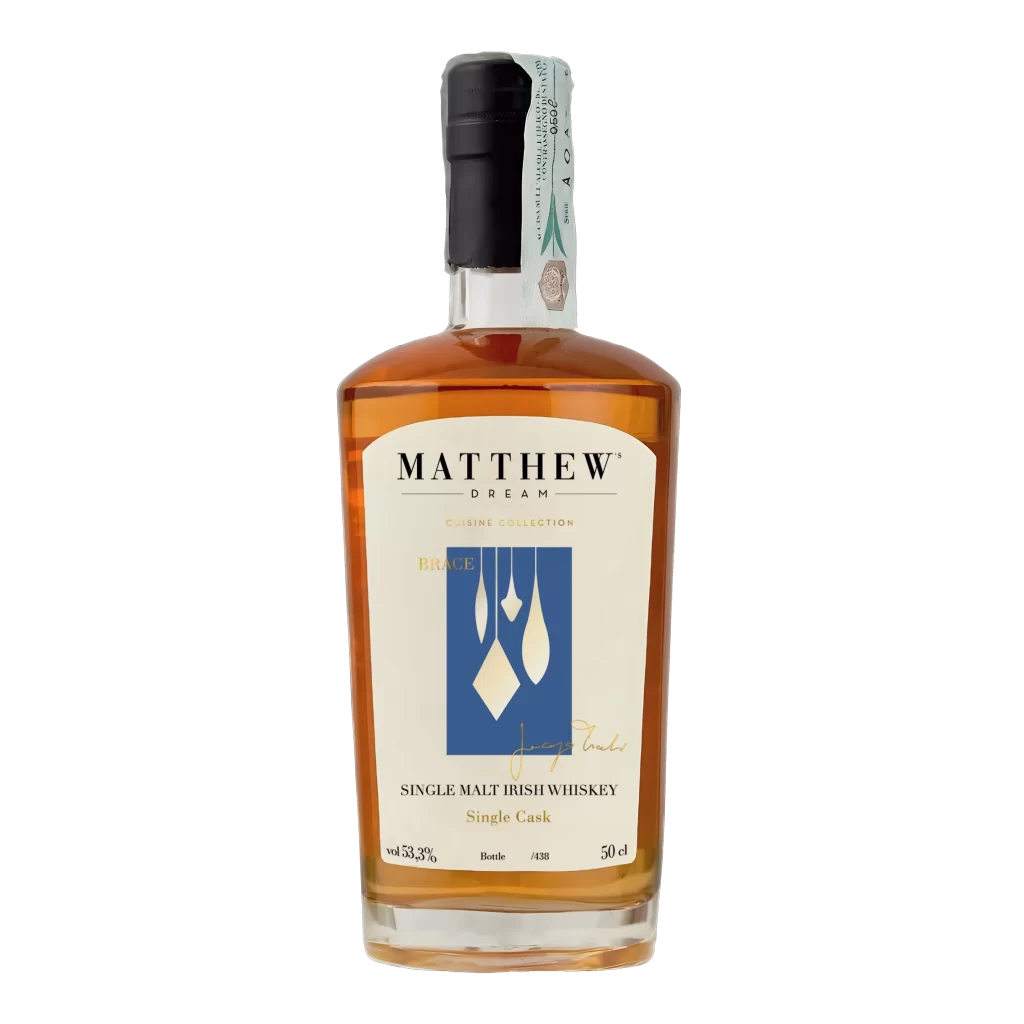 La nuova avventura degli amici Marco e Federico, i due sognatori che si sono inventati Dream Whisky, è di quelle che – come direbbe il Cumenda – “ci esaltano”. Dopo i primi imbottigliamenti di Scotch, i “creative blend” di whiskey americano e perfino un paio di distillati di frutta, ultimamente si sono concentrati sugli Irish. Prima con tre single cask, poi con il continuativo Matthew e infine con la Cuisine Collection, in cui tre chef hanno selezionato tre barili che in qualche modo richiamassero i capisaldi della loro cucina. Il primo è appunto questo “Brace”, scelto con Jacopo Ticchi della Trattoria da Lucio di Rimini: single malt irlandese torbato e sottoposto a tripla distillazione, che è invecchiato in un barile ex bourbon e poi è stato affinato in una botte ex rum australiano. Come forse i più attenti potranno cogliere, la specialità della casa sono le grigliate… Il colore è ambrato chiaro.