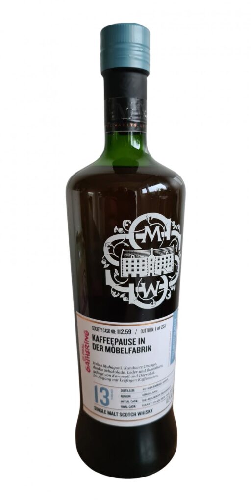 Single malt distillato a Loch Lomond, che i creativi della Scotch malt whisky society hanno chiamato “Kaffeepause in der Mobelfabrik”, che in tedesco significa “Pausa caffè nel mobilificio”. Ora, con tutta la buona volontà, il primo istinto è quello di appiccare un incendio all’ufficio della Society preposto alla scelta dei nomi degli imbottigliamenti, e anche al mobilificio suddetto. 13 anni in un “heavy char new oak” cask, 251 bottiglie. C: ambra rossastra. N: alcolico come un distributore di carburante, ma data la gradazione terrificante ci sta. Pelle lucidata smaltata, torta alle fragole (crostatina). Ci sono note boschive sia fruttate (more), sia balsamiche (ginepro). Rimane pungente, nonostante il caramello ingentilisca tutto. Con acqua si aggiungono albicocche secche e ananas, ma resta lo smalto. P: ancora un filo troppo alcolico, ancora centrato sui frutti rossi (ribes e lamponi). Si fa più interessante col tempo, esplode il tabacco (anche un sigaro acceso, col suo fumino) e si avvicendano tocchi erbacei, che vanno dal té alle alghe. Il secondo palato invece diventa eccessivamente urticante per l’alcol e non convince: di nuovo té nero, ginepro, il caffè di cicoria di cui parla il nome. Diluito è infinitamente meglio, trova un equilibrio e il filo di fumo si fa più persistente. F: erbaceo e di nuovo alcolico, con chili. Ma è lungo e tutto sommato due gocce d’acqua lo rendono più ampio e convincente.