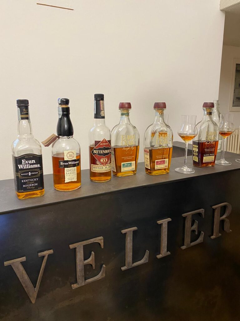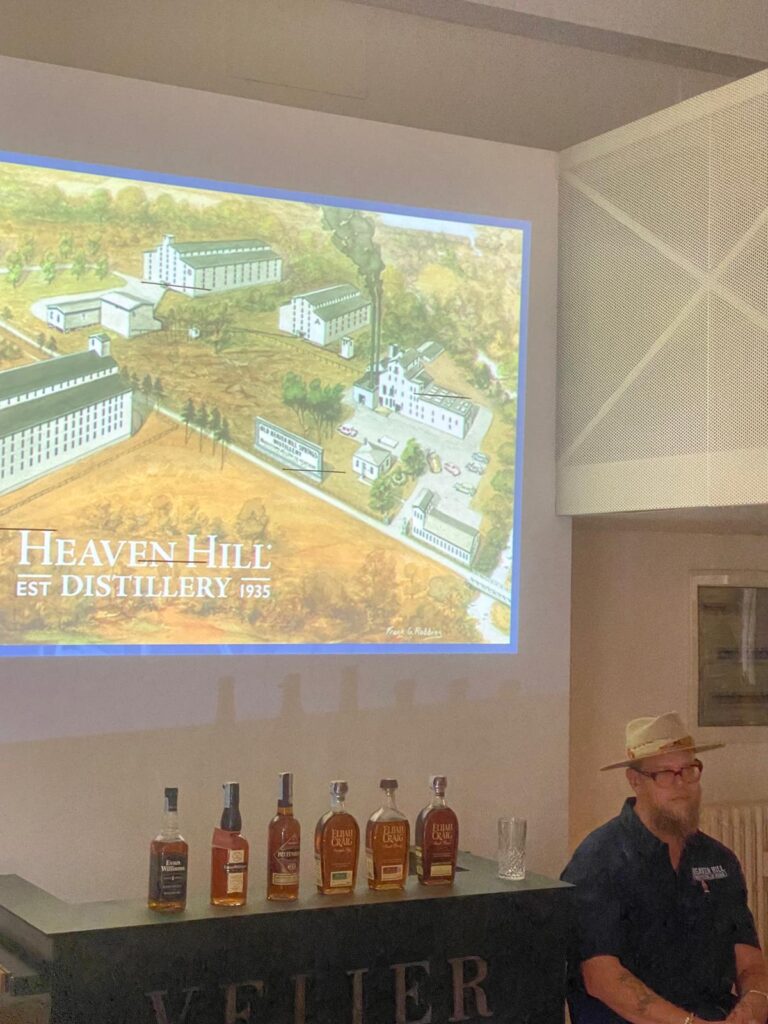 Con Benji abbiamo chiacchierato dell’heritage di Heaven Hill, del boom di distillerie USA (erano 10 nel 2005, sono 2700 oggi), della produzione sempre gigantesca, dell’alambicco a colonna di 35 metri… Insomma, ci siamo stati tutto il pomeriggio, quindi di nozioni ne abbiamo apprese parecchie. Ma il tutto bevendo anche parecchi whiskey. Siamo partiti da un entry level che non abbiamo ancora recensito, ovvero l’Evan Williams. Che è stato lanciato nel 1977 in un decanter con bourbon di 7 anni e rischiò di essere spazzato via, dato l’insuccesso. La scelta fu invece renderlo più “facile” (un whiskeyfacile, diremmo noi con una certa dose di mitomania…): bottiglia quadrata perfetta per il trasporto, etichetta in bianco e nero per una stampa più economica… “Una cosa da bere a casa”, come dice Benji.