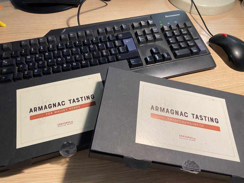 Alla gente normale di solito non capita di aprire un cassetto della scrivania in ufficio e di trovare sotto la cartellina dei documenti due box di samples di Armagnac provenienti dalla Germania. O almeno, da un nostro sondaggio fra i colleghi, non risultano altri casi, ma magari voi avete dei colleghi più originali. Fatto sta ed è, che dai meandri del tempo e della nostra proverbiale propensione all’ordine sono riemerse queste due box di campioni realizzati dal fantastico sito armagnac.de in occasione dell’Armagnac festival di Stoccarda. Del 2024… Va beh, per fortuna l’Armagnac, come il whisky, non svanisce. E dunque possiamo provarli tutti di fila, senza pietà, senza sosta, senza senso. Iniziamo con i primi 6, racchiusi nel cofanetto “Entdeckungsreise”, ovvero viaggio di esplorazione.