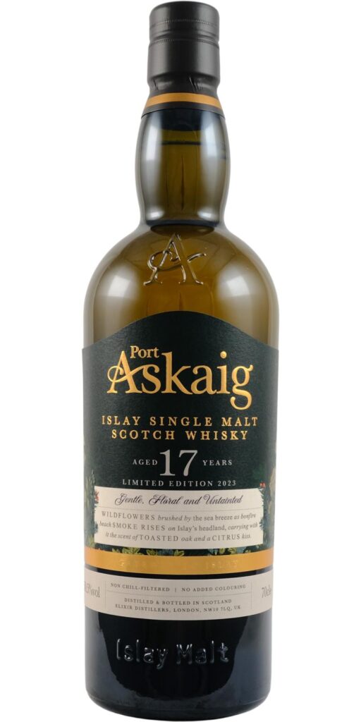 Port Askaig è quel paesino sulle rive del Sound of Islay – lo stretto che separa l’isola da Jura -, dove attraccano alcuni dei traghetti dalla terraferma. Si dà il caso che a Port Askaig sorga la Caol Ila distillery, non aggiungeremo altro. Comunque, Port Askaig è il nome scelto dalla Elixir Distillers di Sukhinder Singh (ex The Whisky Exchange) per il suo torbato di linea. Questa è la release invecchiata 17 anni, lanciata nel 2023. Il colore è un bell’oro chiaro.