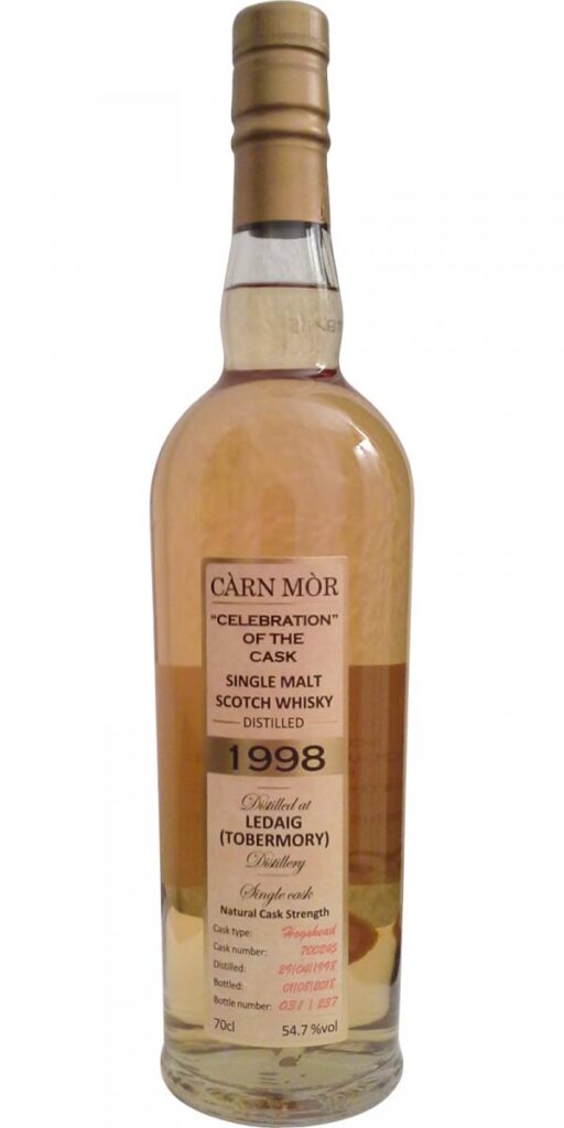 Ripeschiamo dall’armadietto un vecchio sample targato Càrn Mòr, l’etichetta di imbottigliamenti indipendenti di Morrison Mackay. In particolare oggi beviamo il cask 700245, un Ledaig invecchiato vent’anni. Siamo succinti, assaggiamo questo dram dal colore dorato chiaro con riflessi quasi verdini.