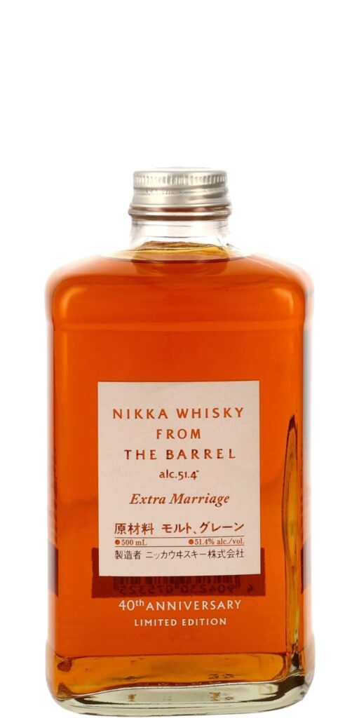 La bottiglia è unica, diremmo “iconica” se non fosse tra i 5 vocaboli che odiamo di più nello Zanichelli (sì, un altro è “virale”). Comunque, la bottiglia del Nikka from the Barrel è tutt’ora inarrivabile, con quel suo design che fa molto laboratorio di profumeria francese. Si tratta del blended whisky più famoso di casa Nikka, lanciato nel 1985. Per il quarantesimo anniversario, ne hanno prodotta una versione speciale, in cui le oltre sue cento componenti (malto Yoichi, malto Miyagikyo e grain whisky distillato nei Coffey still, invecchiati in ex bourbon barrel e in refill hogshead) subiscono un “extra-marriage”. Ovvero, dopo l’assemblaggio, invece dei consueti tre mesi di riposo, ne trascorrono sei. Il risultato pare essere ancor più morbido e soave, tipo un kimono di seta, un velo di ricciola sul nighiri, possiamo continuare con le cazzate all’infinito, lo sapete… Ma preferiamo andare al sodo: color aranciato.